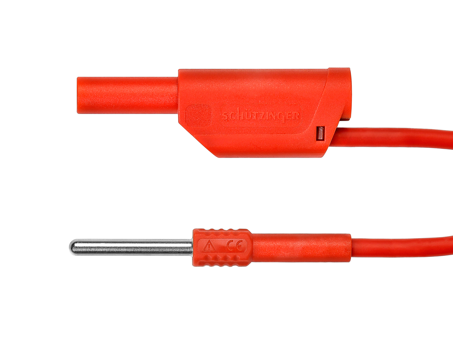 - 1 Sicherheits-Federkorbstecker mit axialer Steckbuchse und 1 Stecker mit Stift Ø 3,5 mm, konfektioniert an hochflexibler, doppelt-isolierter PVC-Leitung 1 mm²