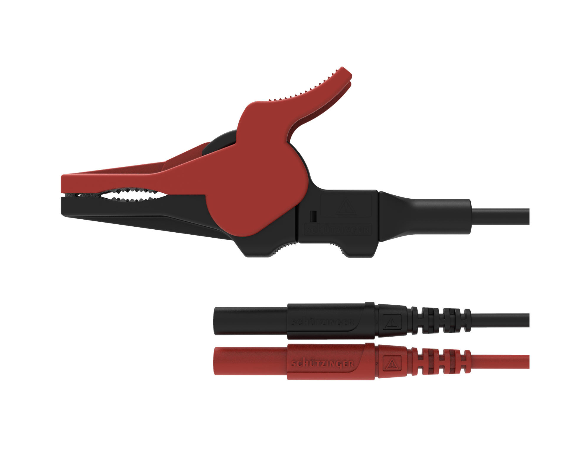 - 2 Sicherheits-Federkorbstecker konfektioniert an hochflexibler, doppelt-isolierter PVC-Leitung 1 mm² und Sicherheits-Kelvinklemme