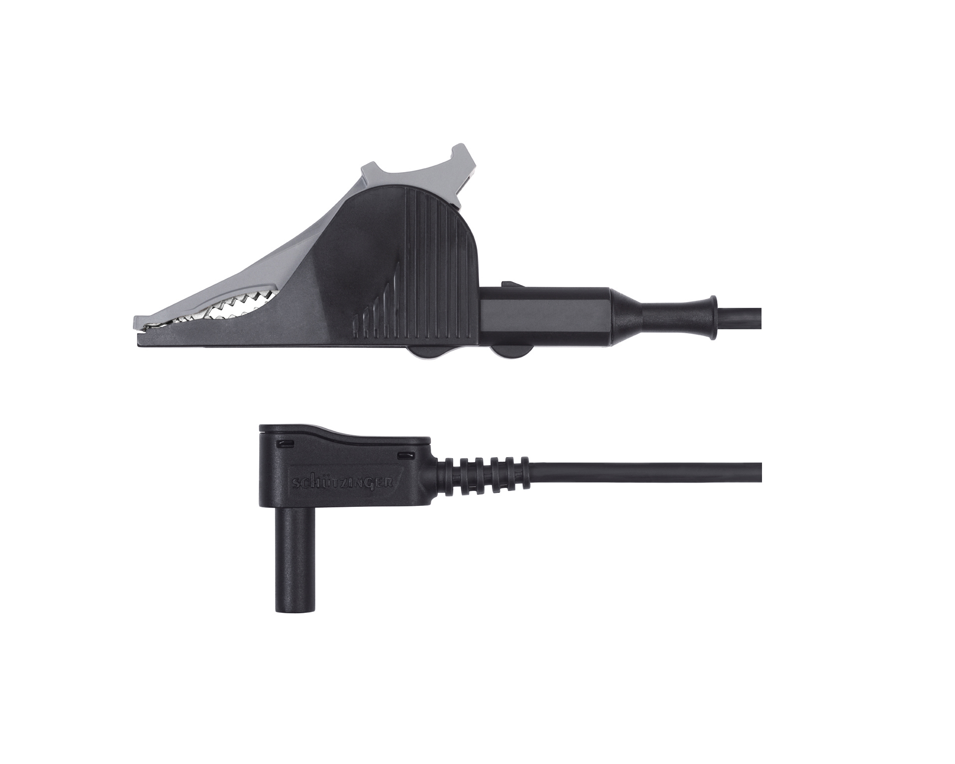 - Sicherheits-Winkel-Federkorbstecker konfektioniert an hochflexibler doppelt-isolierter PVC-Leitung 2,5 mm² und Sicherheits-Abgreifklemme mit Klemmbereich Ø 32 mm