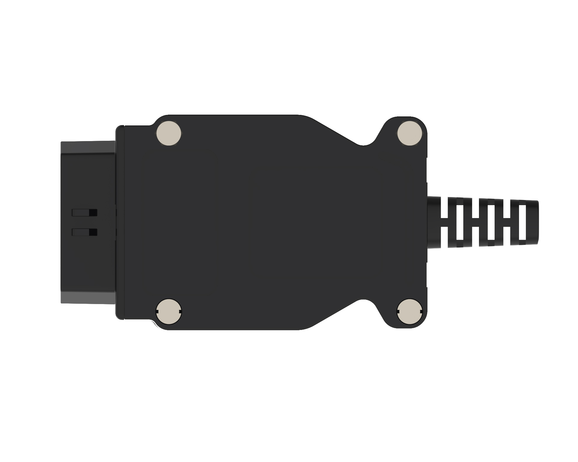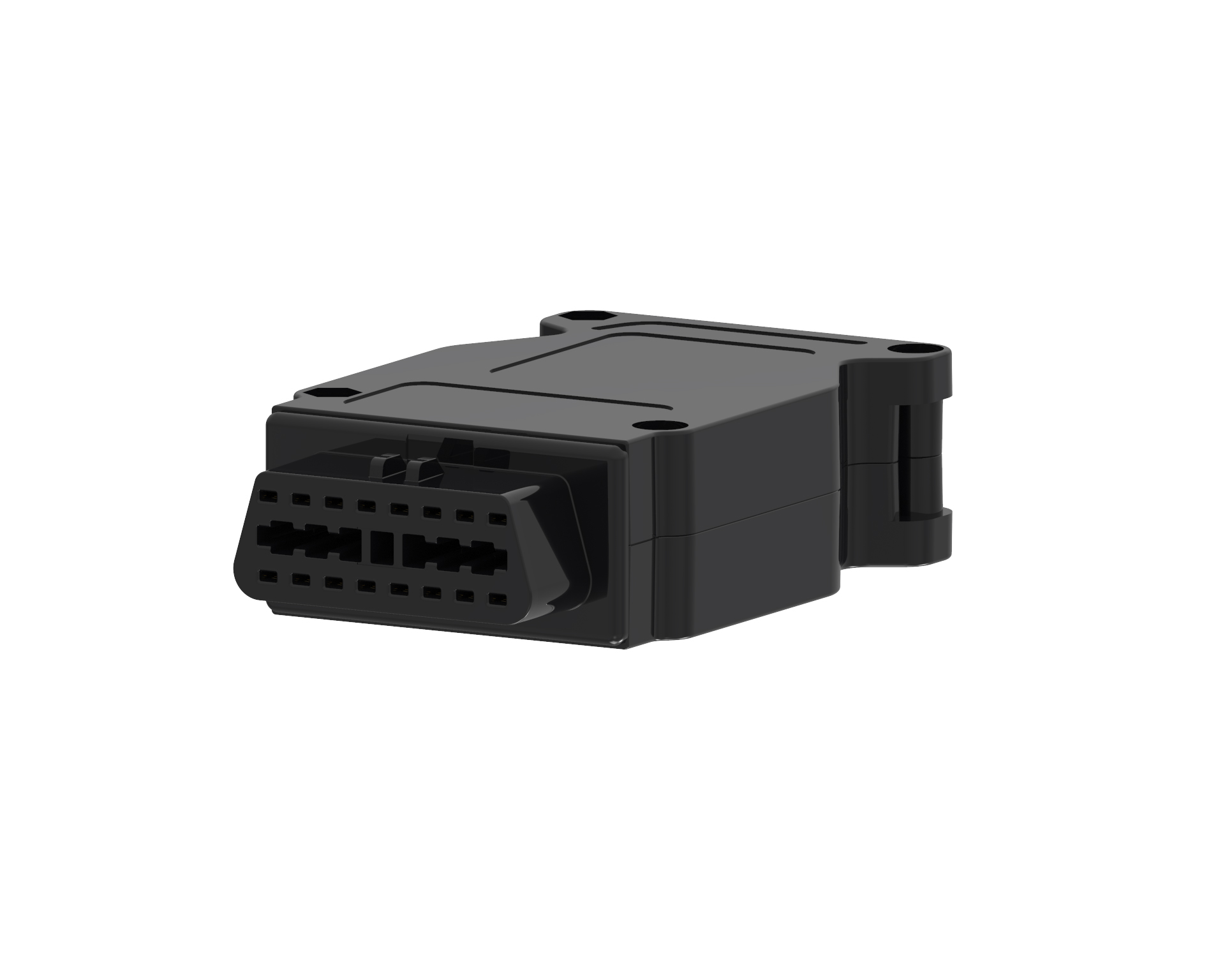 - Set mit Gehäuse aus PA6 mit Glaskugeln (UL94–HB) oder Glasfasern (UL94–V0) verstärkt, OBD-II-Stecker und Knickschutztülle für Kabel bis Ø 8 mm