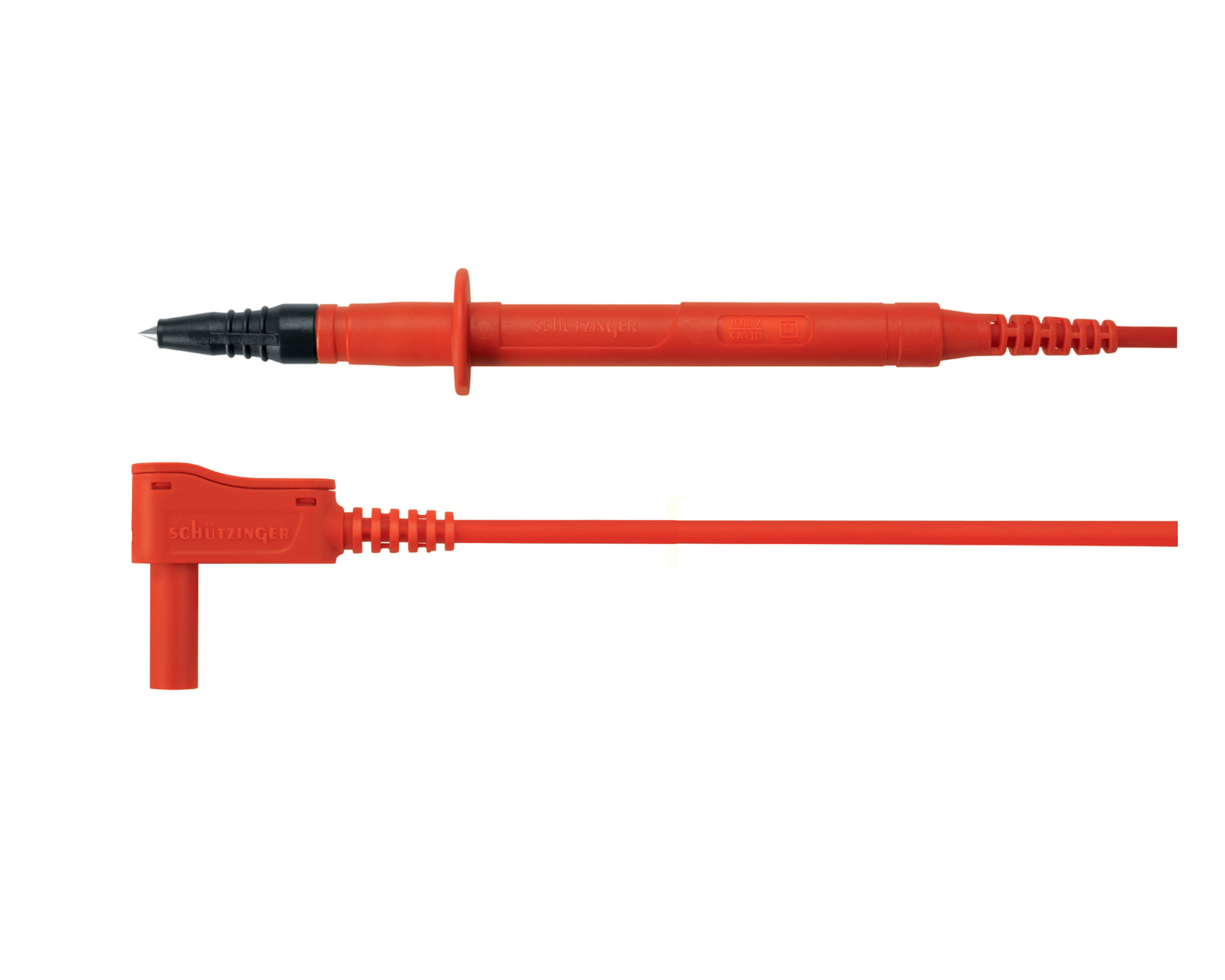 - 1 Sicherheits-Prüfspitze und 1 Sicherheits-Federkorb-Winkelstecker, konfektioniert an hochflexibler, doppelt-isolierter PVC-Leitung 1 mm²