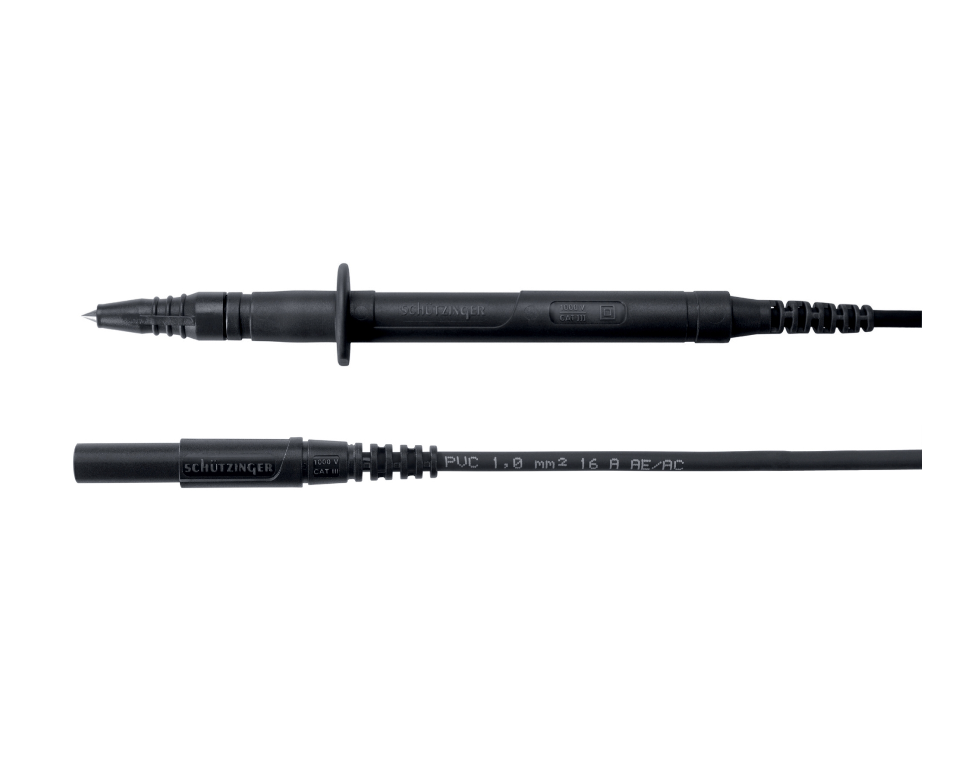 - 1 Sicherheits-Prüfspitze und 1 Sicherheits-Federkorbstecker, konfektioniert an hochflexibler, doppelt-isolierter PVC-Leitung 1 mm²
